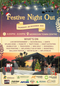 Merredin’s Festive Night Out is an annual family-friendly event with live entertainment, fun activities, delicious food, market stalls, and plenty of Christmas cheer.